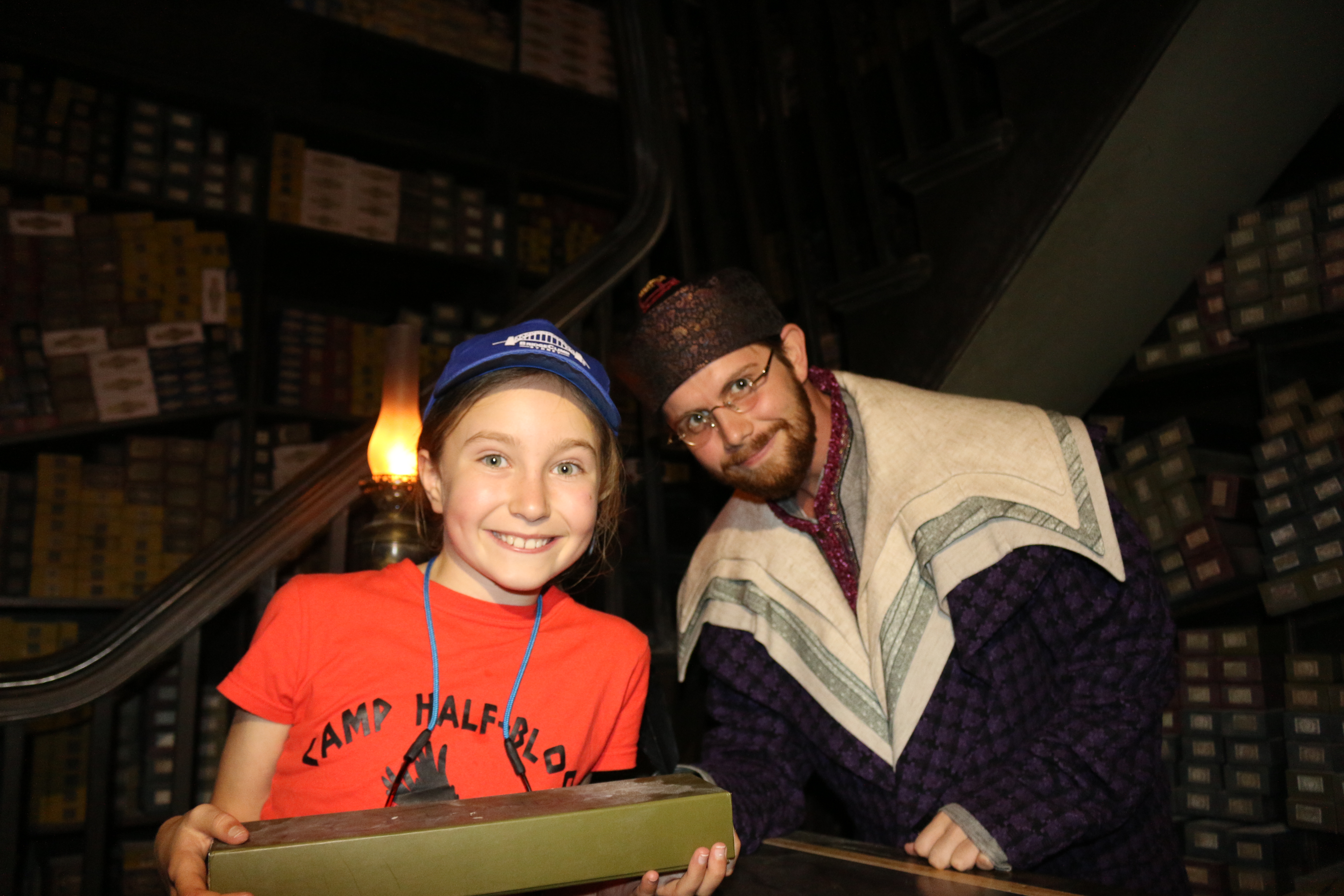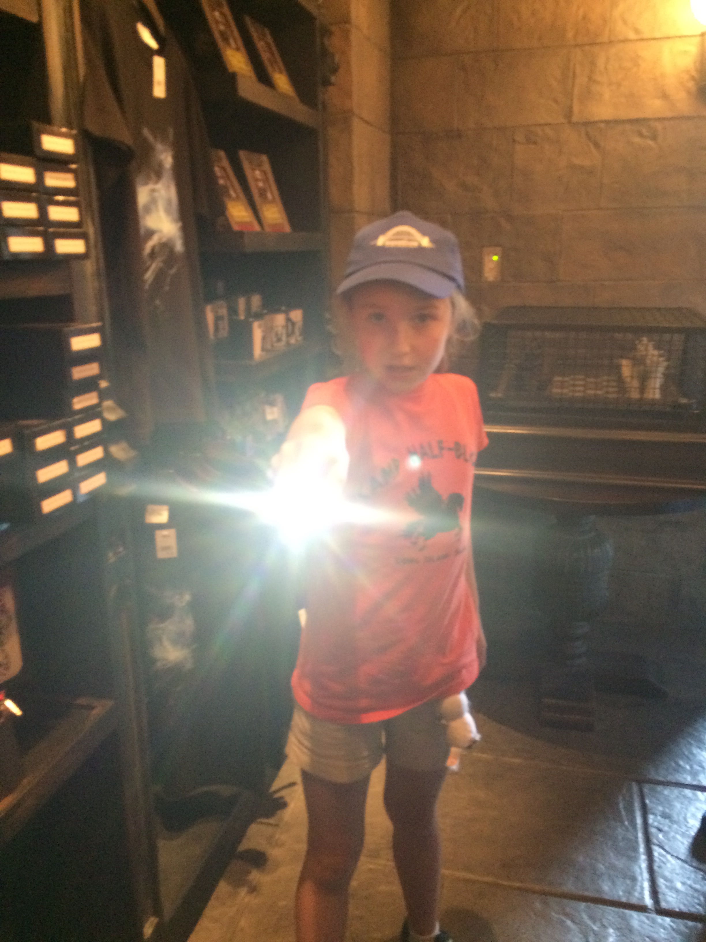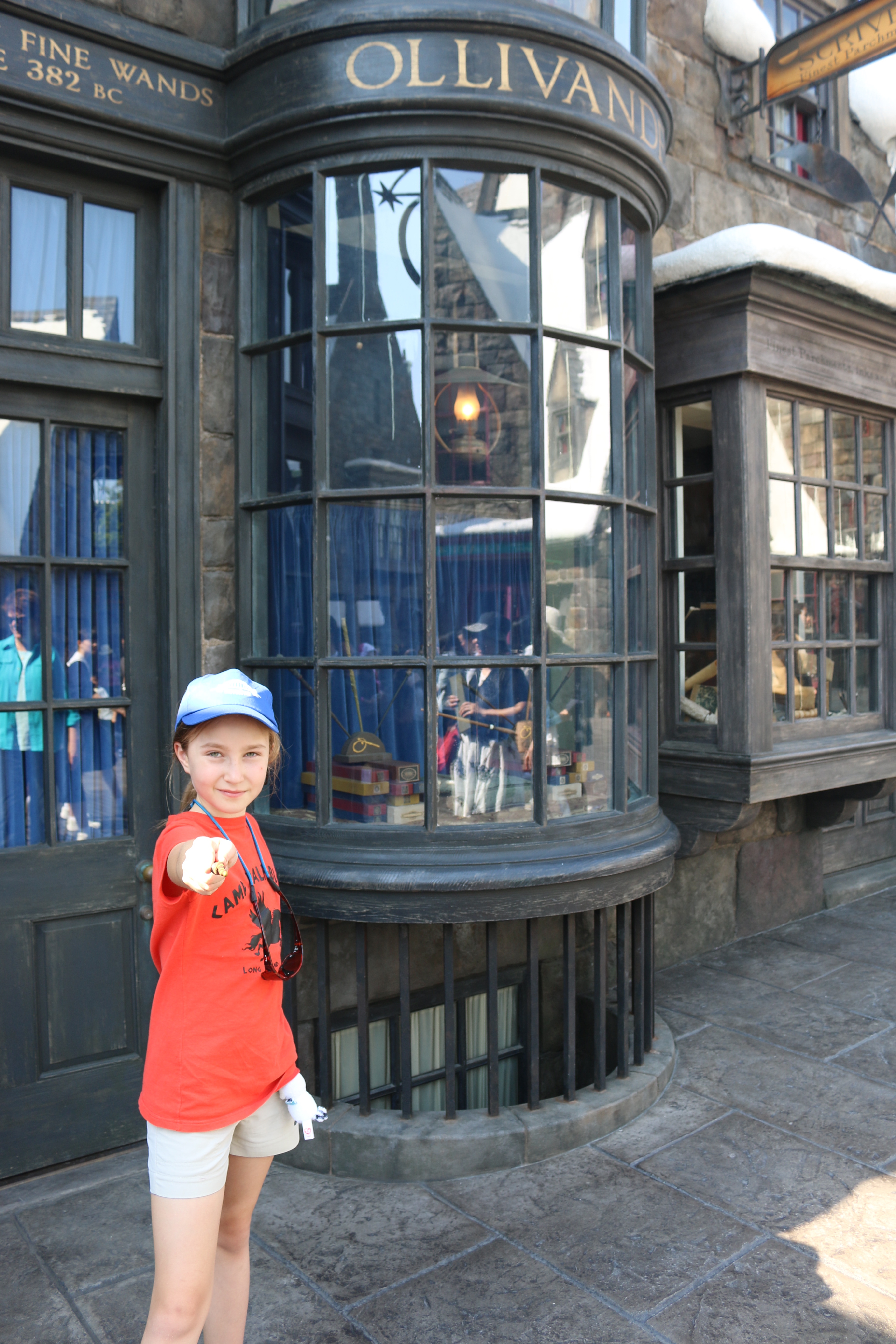 When a group of 30 of us walked in Ollivanders Wand Shop, Mr. Ollivanders said that I was the chosen one to get a wand that day! I was so EXCITED!! He looked through his wands and had ME test the spells…”Wingardrium Leviosa” and “Alohomora” until the room lit up and the wand found me!!